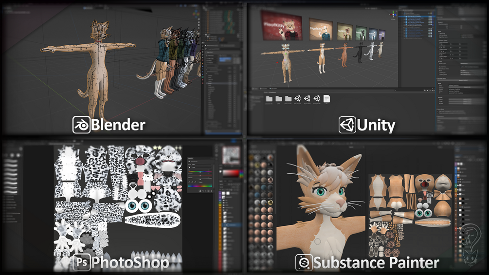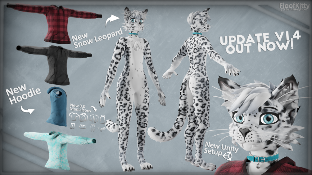The FloofKitty is a anthropomorphic feline avatar base I made 100% from scratch for VRChat! this project originally started life as my first full from scratch avatar.. my goal was just to have an avatar that I liked and to better fit myself but as I continued to work on the avatar I started to think more and more about how other people might like it and with that in mind things quickly got out of hand :P so after a lot of time/work and many revisions later here we are! :3 I really have put a lot of heart and soul into this project and I really hope you like it ^^